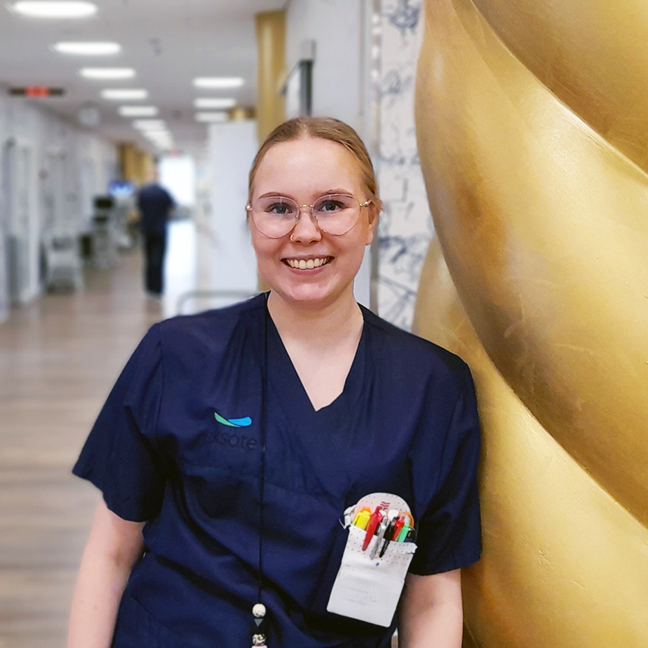 Hymyilevä silmälasit omaava nuori nainen hymyilee kameralle. Hänellä on tummansininen lyhythihainen sairaanhoitajan työasu ja hän seisoo sairaalan käytävällä nojaten kullanväriseen kierteiseen paksuun pylvääseen.