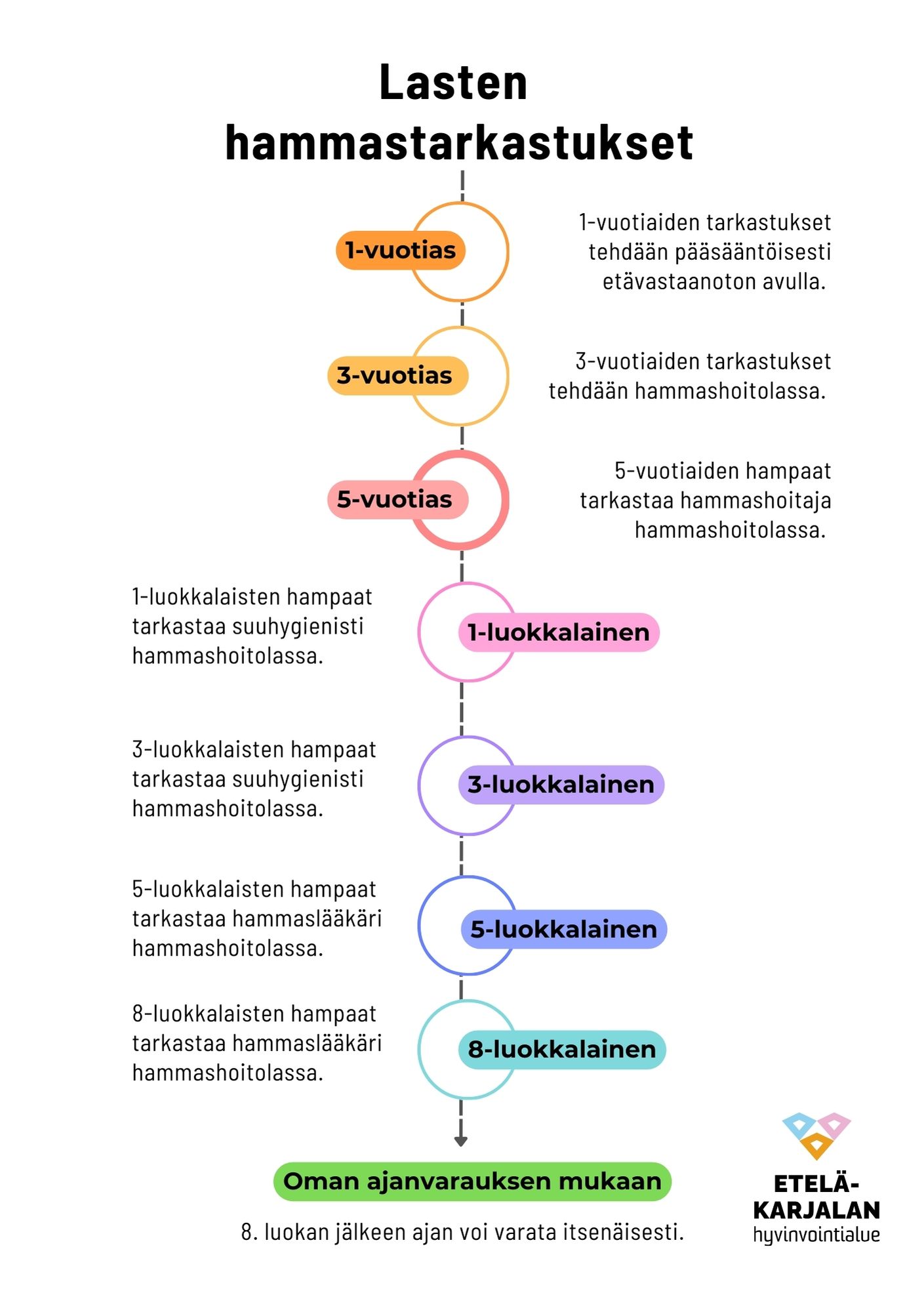 Lasten hampaista pidetään huolta Etelä-Karjalan hyvinvointialueen suun terveyden määräaikaisissa hammastarkastuksissa. Tarkastukset aloitetaan jo yksivuotiaista, ja viimeinen tarkastuskutsu tulee 8. luokkalaiselle nuorelle. Yksivuotiaan suun terveyden tarkastukset tehdään etänä verkkoyhteydellä, mutta ajan saa halutessaan vaihtaa myös hammashoitola-ajaksi.