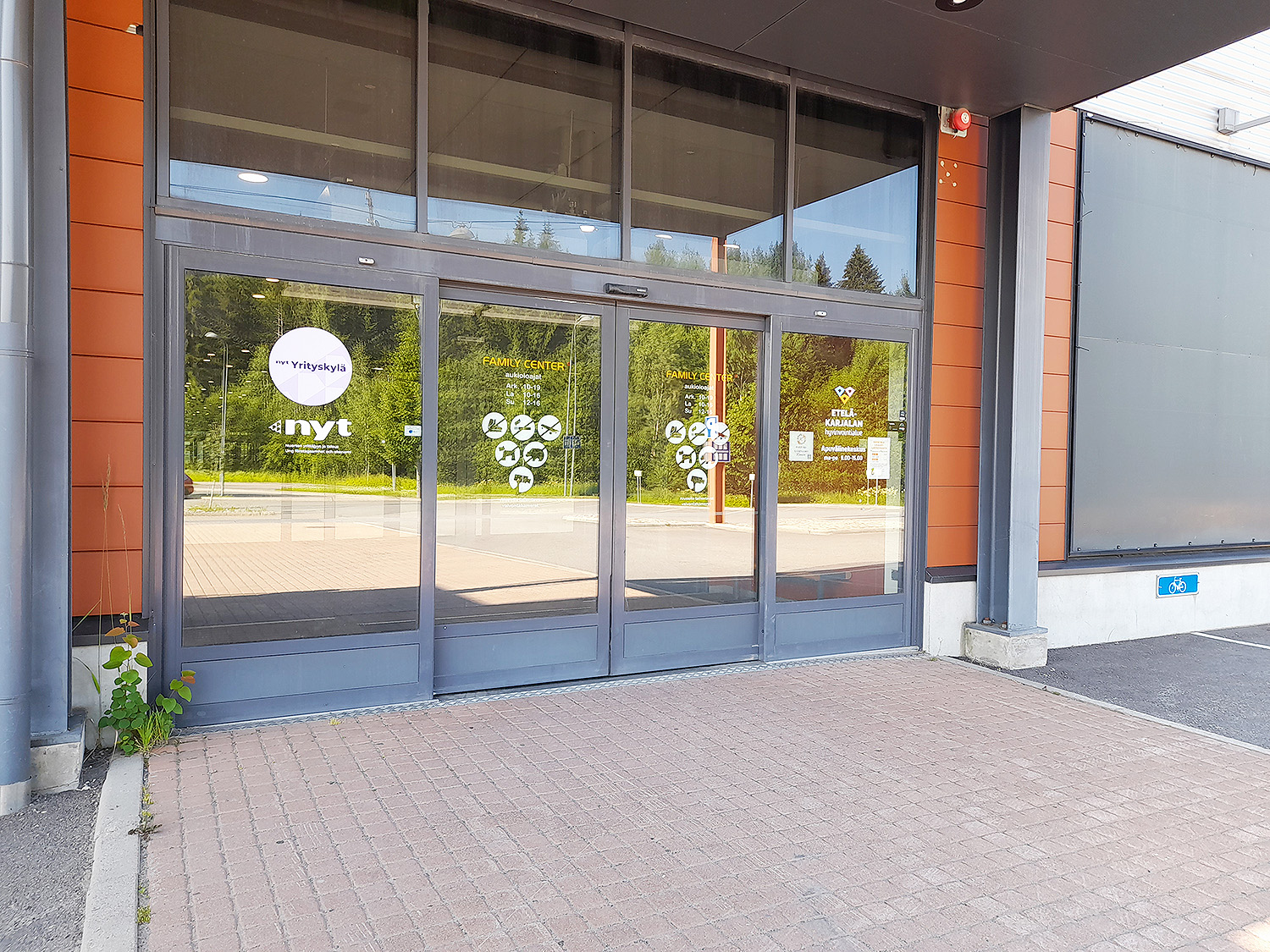 Sisäänkäynti Kauppakeskus Family Centerin hoitotarvikkeiden noutokaapeille tapahtuu kätevimmin parkkialueelta katsoen talon oikean puolen sisäänkäynnistä.