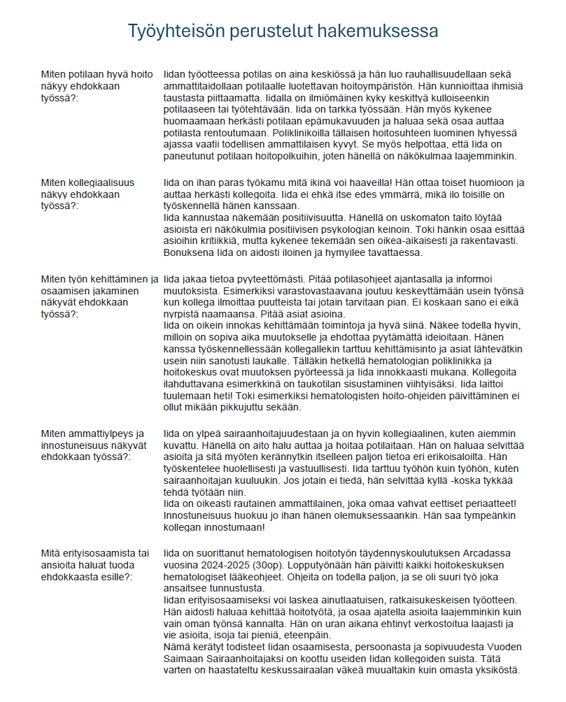 –Tunnustuksen saajan tulee olla ammatistaan ylpeä ja toimia potilaan parhaaksi yhteistyössä työtovereiden ja opiskelijoiden kanssa. Hän on innostunut ja valmis kehittämään sekä omaa että työyhteisön ammatillista osaamista ja jakaa osaamistaan laajemminkin. Hän on työyhteisössään suunnannäyttäjä. Ja Iida on juuri tällainen sairaanhoitaja!