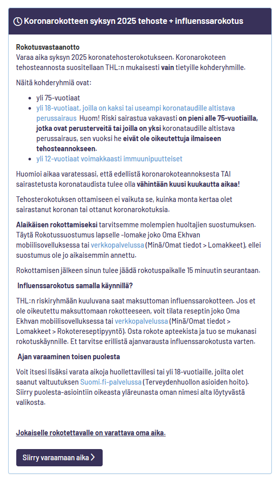 Jos olet varannut ajan sekä influenssa- että koronarokotukseen, mutta et kuulu koronarokotuksen kohderyhmään, voit perua ajan Oma Ekhvassa ja varata uuden ajan pelkälle influenssarokotukselle. Mutta ei haittaa, vaikka et peruisi aikaa – jos olet oikeutettu vain influenssarokotukseen, saat rokotustilanteessa ainoastaan sen.
